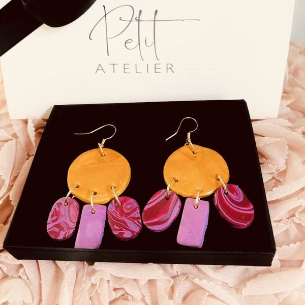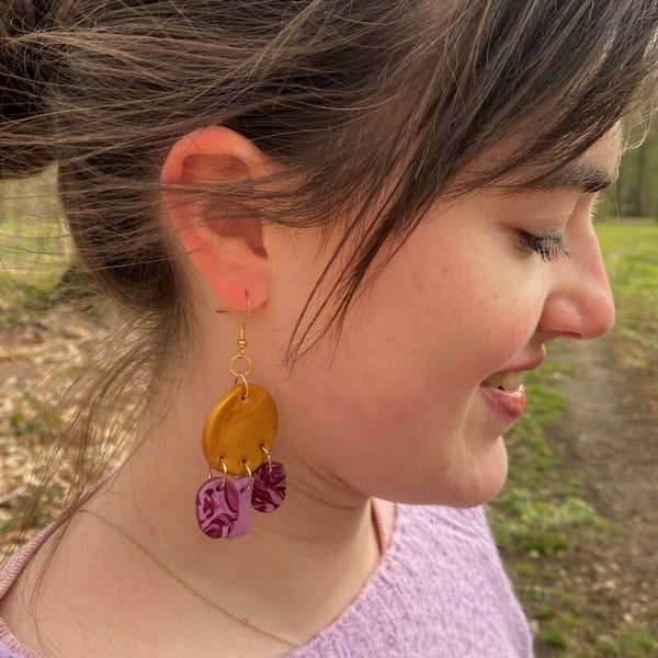- Lengte: ongeveer 7,5 cm - kleur: goud, paars, roze- Materiaal: Polymeerklei, vernis, roestvrijstaal ringetjes en Ag925 (verguld zilver) haakjes