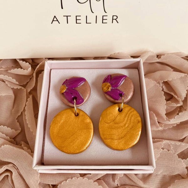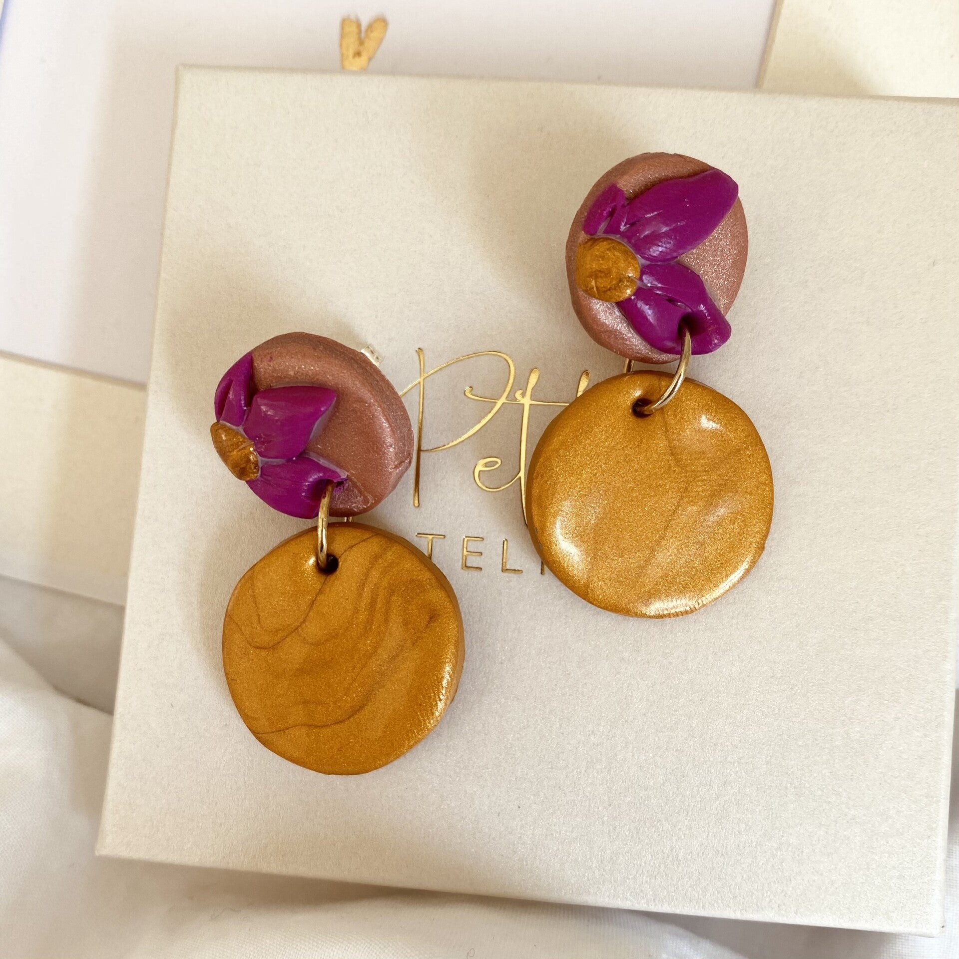 - Lengte: ongeveer 4,5 cm - kleur: goud, lichtpaars en roze- Materiaal: Polymeerklei, vernis, roestvrijstaal ringetjes en Ag925 (zilver) oorstekers