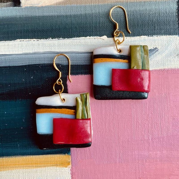 - Lengte: ongeveer- kleur: wit, lichtblauw, zwart, goud, groen en roze- Materiaal: Polymeerklei, vernis, roestvrijstaal ringetjes en Ag925 (verguld zilver) oorhaakjes