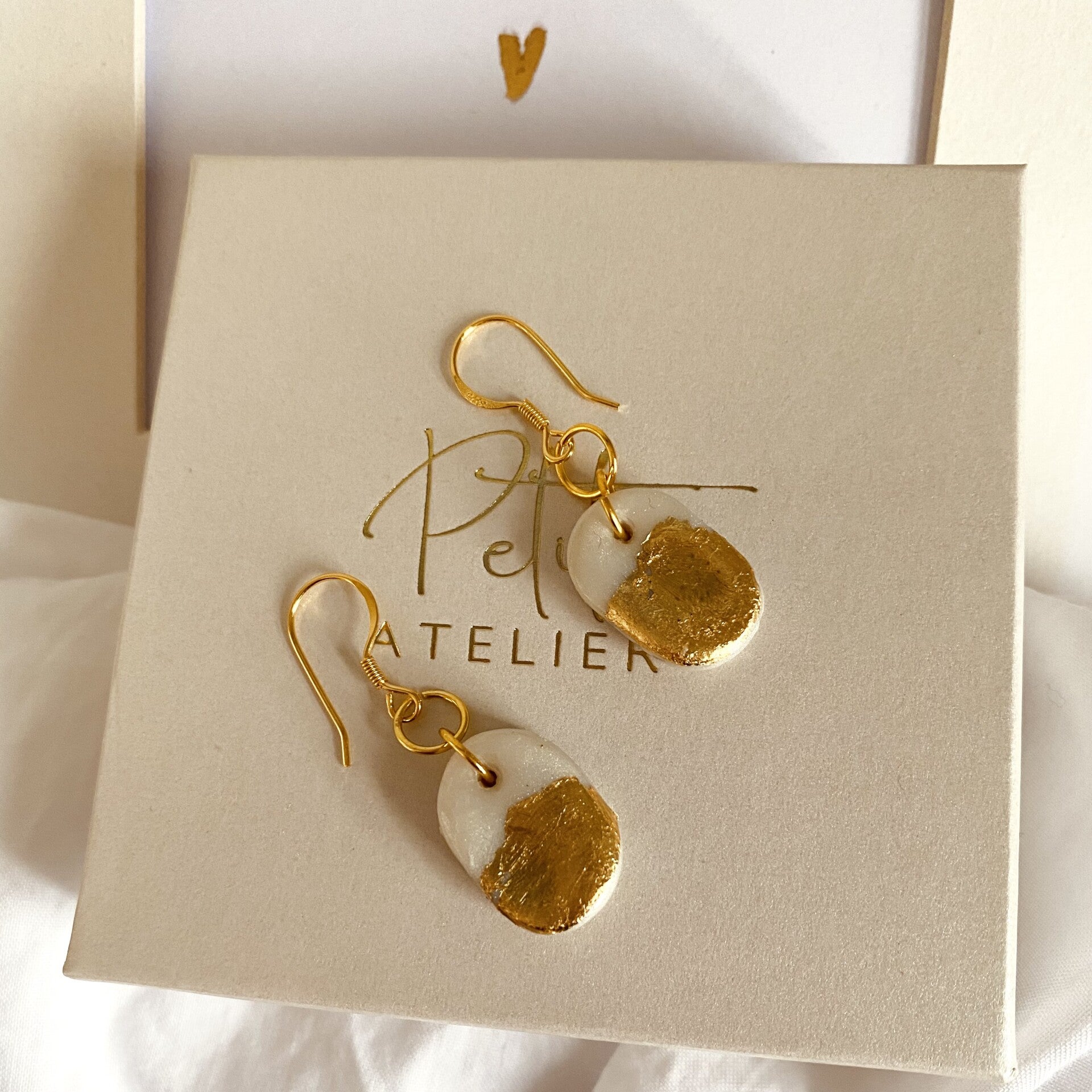 - Materiaal: Polymeerklei, vernis, roestvrijstaal ringetjes, Ag925 (verguld zilver) oorstekers en bladgoud