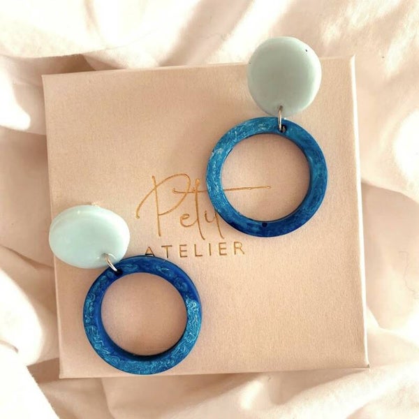 - Lengte: ongeveer 5 cm - kleur: donker en lichtblauw- Materiaal: Hoogwaardig epoxy giethars, polymeerklei, Ag925 (verguld zilver) oorstekers
