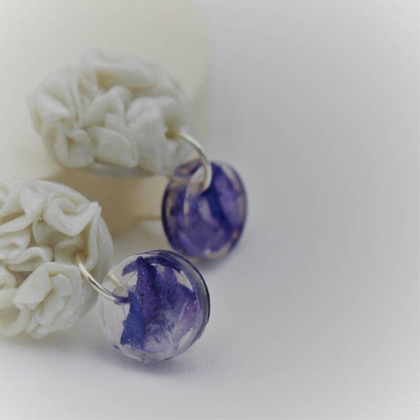Materiaal: Hoogwaardig epoxy giethars, polymeerklei, Ag925 (verguld zilver) oorstekers en ringetjes, licht om dragen