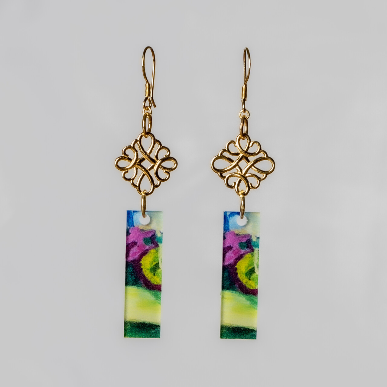 Materiaal : acrylaat 2mm voorzijde glanzend en achterzijde mat, filigraan, haakjes en oogjes in verguld goud