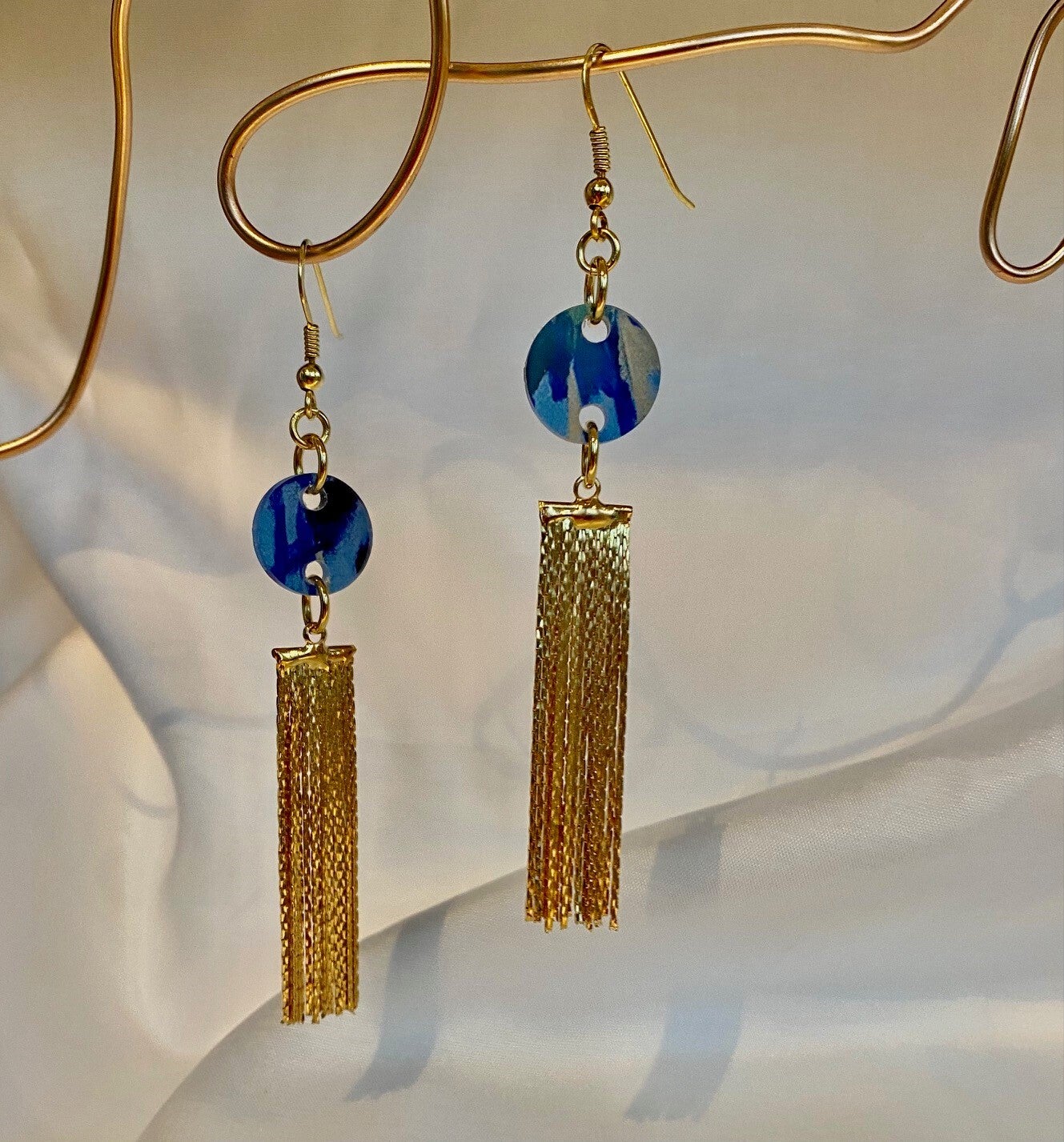 Materiaal : acrylaat 2mm voorzijde glanzend en achterzijde mat, haakjes en oogjes in verguld goud, goudkleurig sierstuk